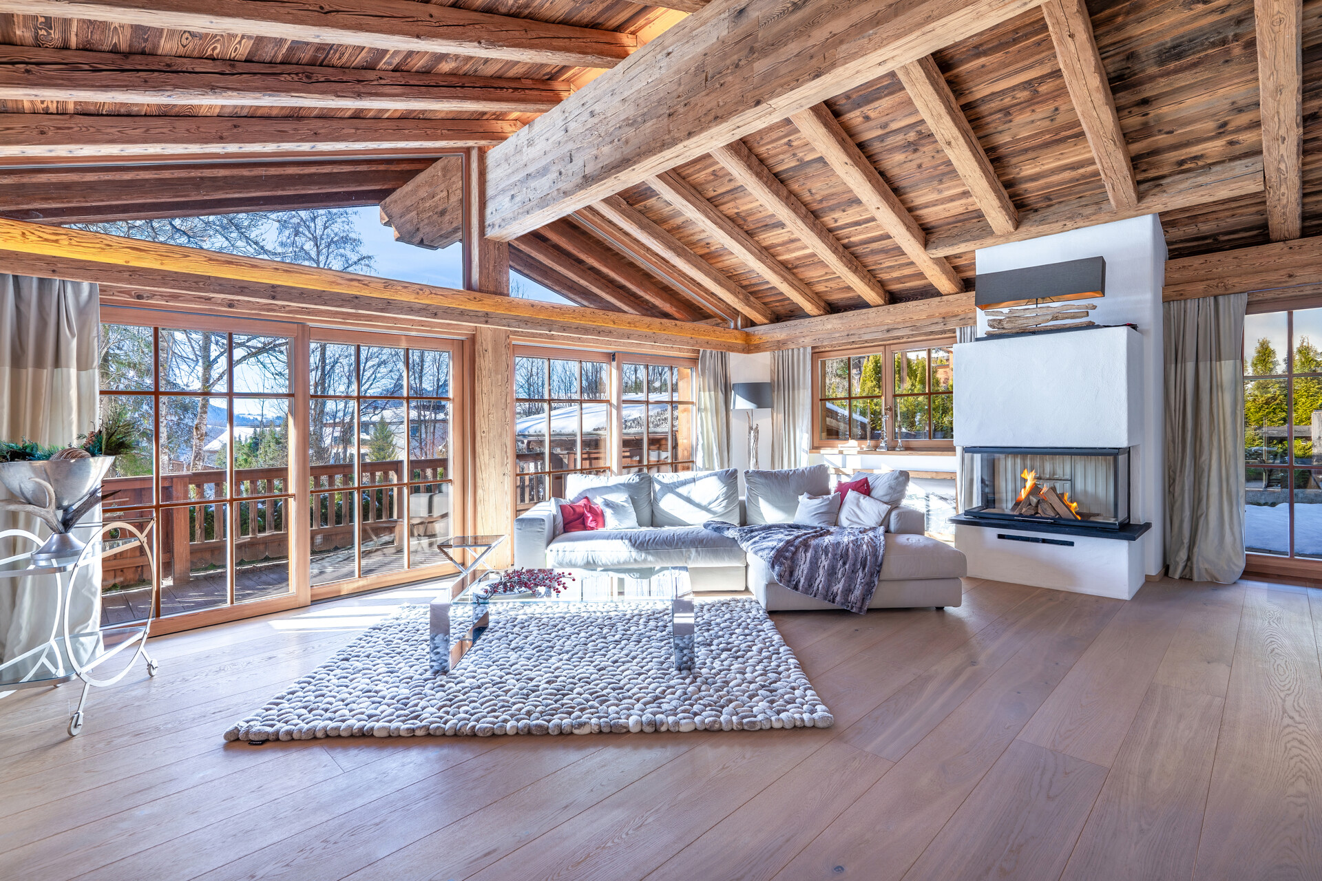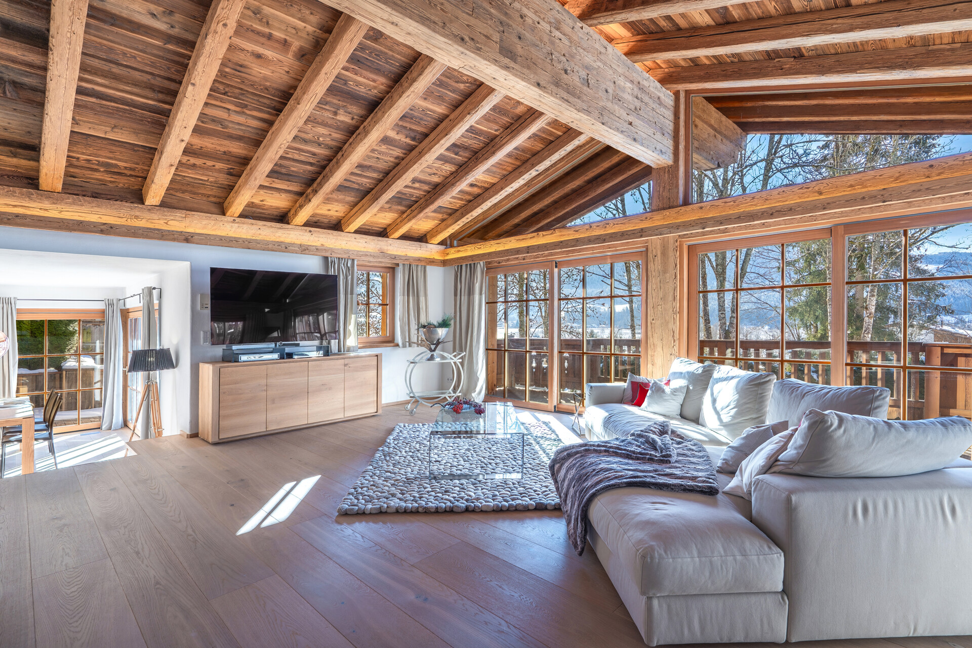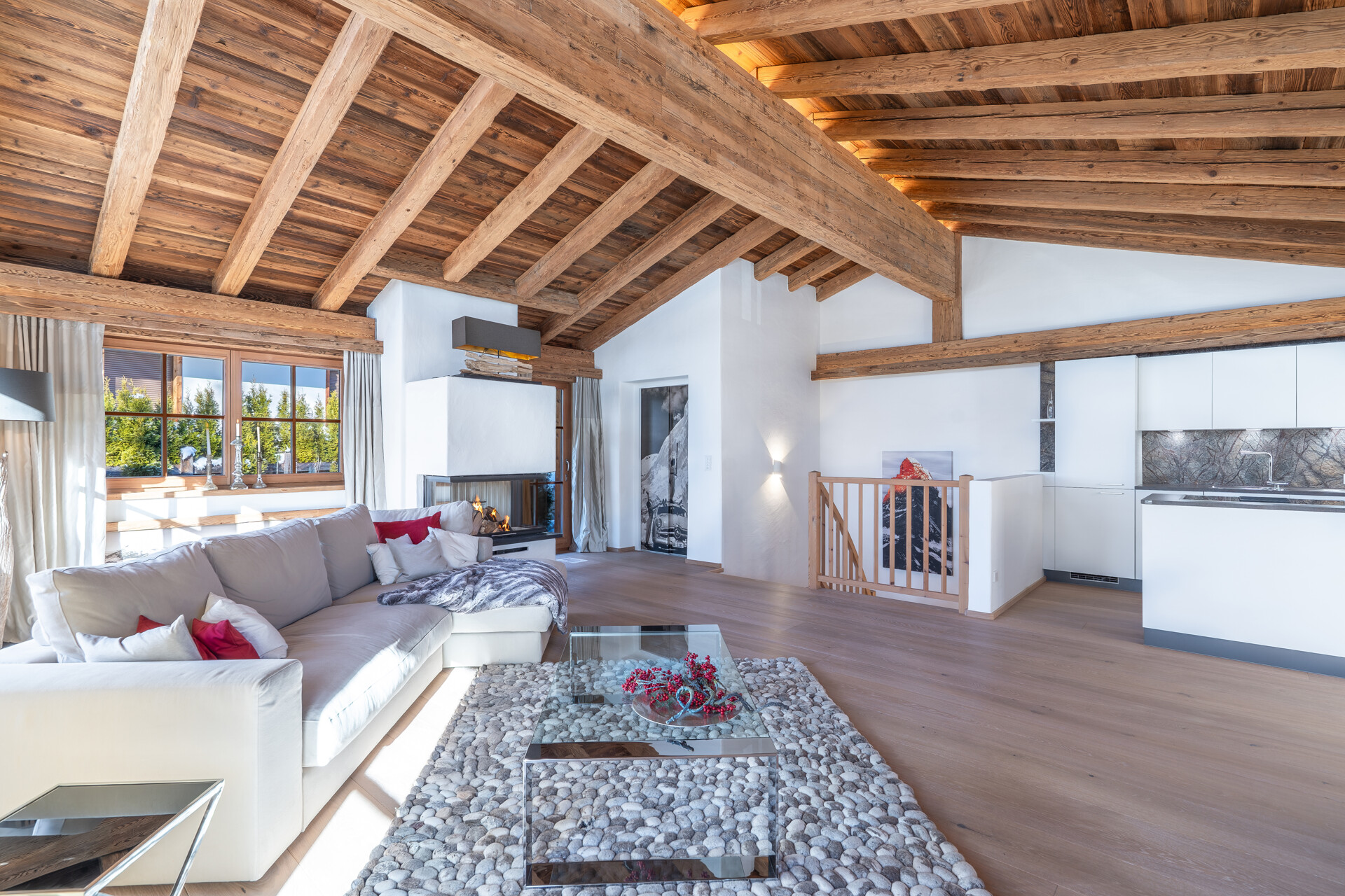 In einer der besten und schönsten Lagen von Ellmau gelegen, präsentiert sich dieses Chalet als außergewöhnliches Zuhause für alle, die Ruhe, Privatsphäre und einen traumhaften Ausblick schätzen. Die Lage überzeugt durch ihre absolute Idylle, ohne dabei auf die Nähe zu den Annehmlichkeiten des Ortes verzichten zu müssen – ein gleichermaßen exklusiver wie harmonischer Rückzugsort am Fuße des Wilden Kaisers. Das Chalet bietet eine durchdachte Architektur und eine Nutzfläche von rund 283 Quadratmetern. Im Erdgeschoss empfängt ein einladendes Entree, das direkt in den privaten Bereich führt. Drei Schlafzimmer mit jeweils Bad en Suite sorgen für höchsten Komfort und Rückzugsmöglichkeiten. Ein stilvoll gestalteter Wellnessbereich lädt zu erholsamen Stunden ein. Weiters finden Sie im Erdgeschoss eine schöne Südwestterrasse, die den Sonnenverlauf ideal einfängt und einen herrlichen Blick in die umliegende Natur bietet. Im Untergeschoss stehen ein großzügiger Hauswirtschaftsraum, ein weiteres Schlafzimmer sowie ein flexibel nutzbarer Allzweckraum zur Verfügung. Ob Fitness, Hobby oder zusätzlicher Stauraum – diese Ebene bietet vielfältige Nutzungsmöglichkeiten und passt sich den individuellen Bedürfnissen perfekt an. Das Obergeschoss bildet das Herzstück des Hauses. Hier öffnet sich ein großzügiger, offen gestalteter Wohn- und Essbereich unter einem beeindruckenden Sichtdachstuhl, der dem Raum eine besondere Weite und Wärme verleiht. Ein offener Kamin schafft eine behagliche Atmosphäre, und die angrenzende Südwestterrasse erweitert den Wohnraum ins Freie und bietet einen wunderschönen Blick über die Landschaft. Komfortabel ergänzt wird das Angebot durch einen Personenaufzug, der alle Ebenen miteinander verbindet, sowie ein Carport direkt am Haus. Dieses Chalet vereint moderne Tiroler Wohnkultur mit exklusiver Lage und hochwertiger Ausstattung – ein Zuhause, das Eleganz, Naturverbundenheit und Lebensqualität in perfekter Balance vereint.