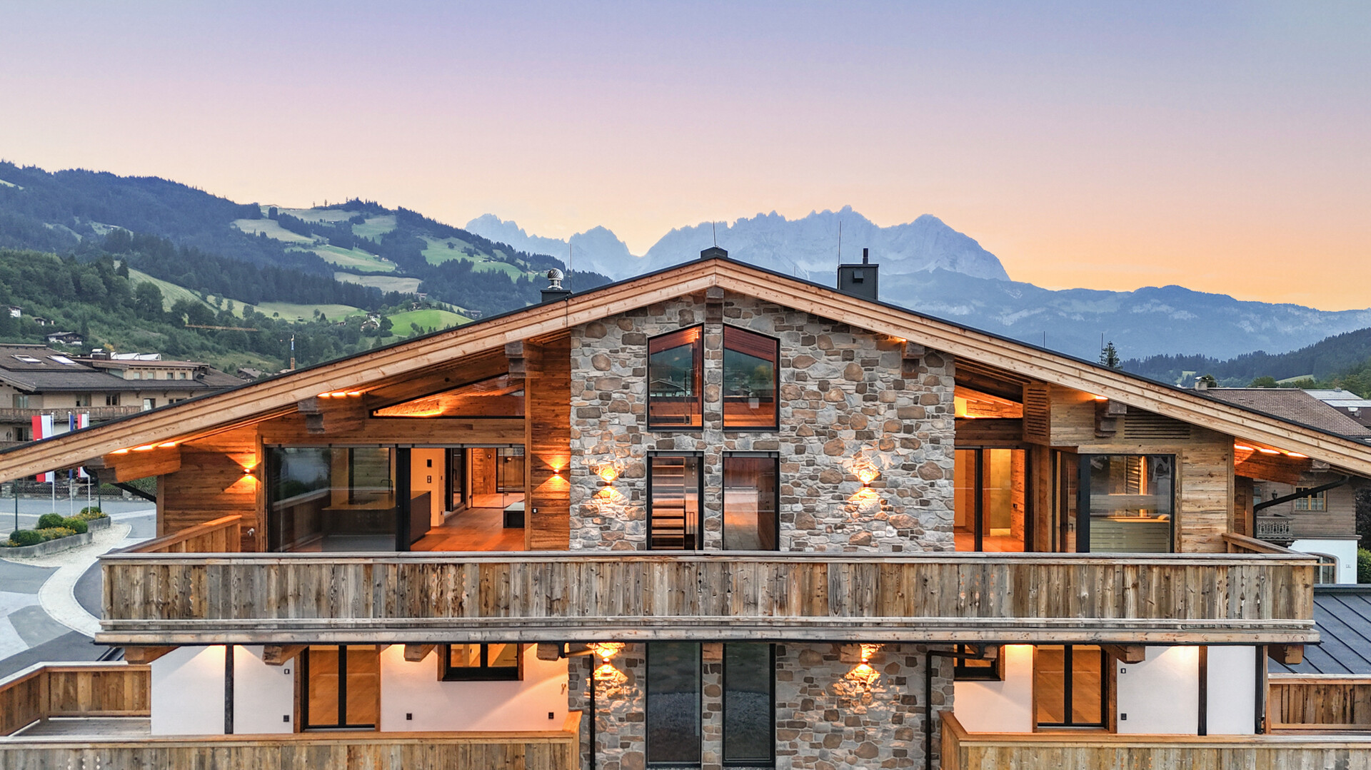 Dieses Penthouse liegt im Herzen von Reith und zeigt eine klare, alpine Architektur mit Naturstein, Altholz und großen Glasflächen. Außen wie innen prägen hochwertige Materialien und eine ruhige, moderne Linie das Gebäude. Der Zugang erfolgt über das Obergeschoss – oder direkt per Lift bis in die Wohnung. Im Obergeschoss führt eine helle, moderne Stiege weiter nach oben. Schon beim Hinaufgehen öffnet sich der Blick zum Wilden Kaiser. Ein Moment, der sofort zeigt, was dieses Penthouse besonders macht. Oben angekommen, steht man direkt im offenen Wohnbereich. Der Wohn- und Essbereich überzeugt mit Sichtdachstuhl, raumhohem Kamin und großformatigen Fensterflächen, die den Kaiserblick auf der Nordostseite und den Hahnenkammblick auf der Südwestseite einfangen. Altholz, Naturstein und klare Formen schaffen ein modernes, warmes Ambiente. Die Designerküche mit Miele- und BORA-Geräten fügt sich präzise in das Gesamtbild ein. Vom Wohnbereich führt eine zweite Stiege zur Galerie – ein zusätzlicher Rückzugsbereich mit erhöhter Perspektive auf Raum und Bergkulisse. Drei Schlafzimmer – zwei davon mit Badezimmer en suite – sowie ein weiteres separates Badezimmer bieten hohen Wohnkomfort. Die Sauna mit Glasfront erweitert das Penthouse um einen stilvollen Wellnessbereich, der den Blick in die Landschaft einbezieht. Mehrere Terrassen und Balkone schaffen fließende Übergänge zwischen Innen- und Außenraum. Moderne Haustechnik, praktische Abstellflächen und die zentrale, dabei ruhige Lage unterstreichen den hohen Anspruch dieses Penthouses.