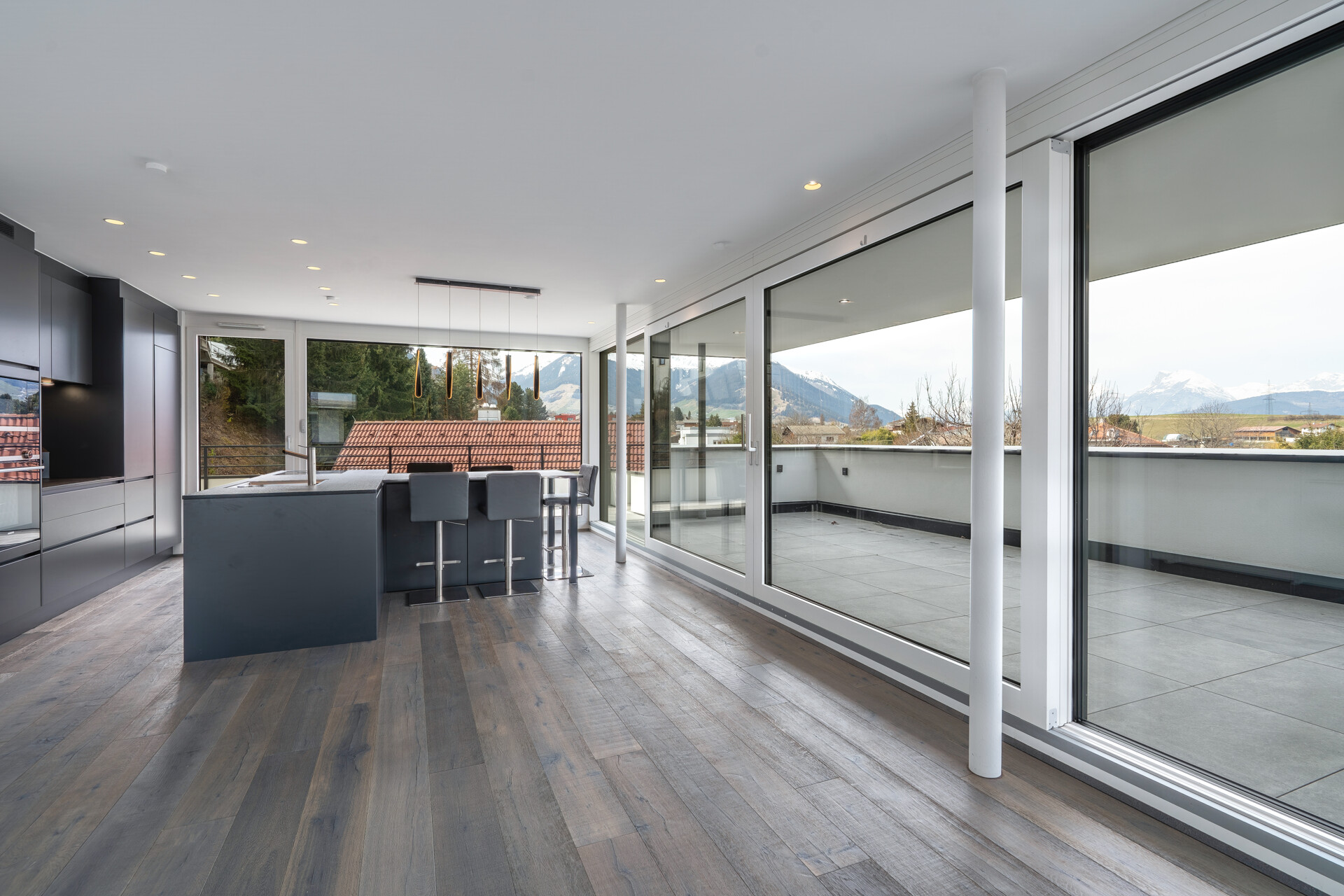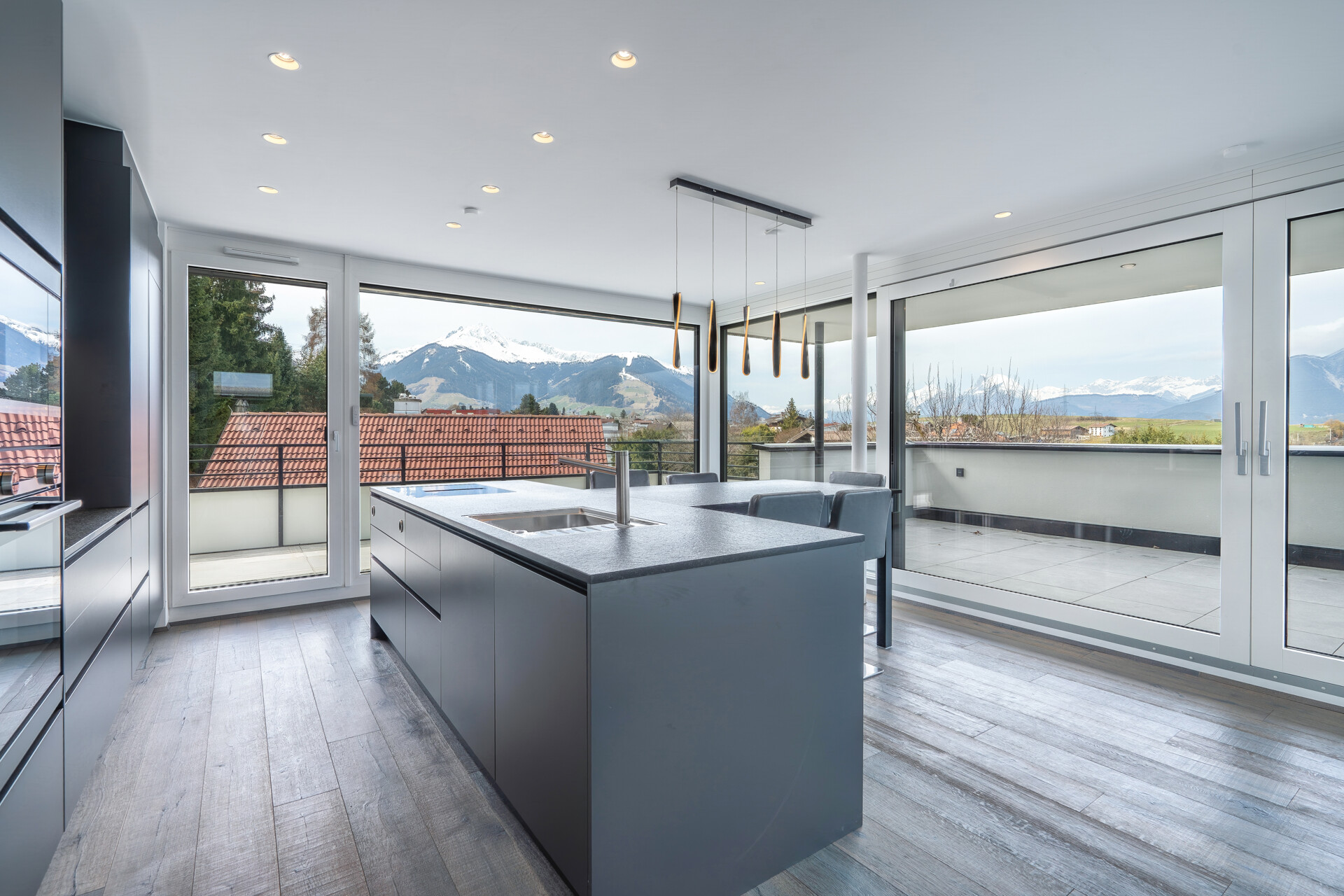 In einer ruhigen, sonnenverwöhnten und dennoch hervorragend angebundenen Lage erwartet Sie dieses außergewöhnliche Penthouse, das im Jahr 2021 von einem renommierten Bauträger in höchster Qualität fertiggestellt wurde. Auf ca. 82 m² Wohnfläche entfaltet sich ein modernes Wohnkonzept, das durch Licht, Weite und eine erstklassige Ausstattung besticht. Das Herzstück der Wohnung bildet der großzügige Wohn- und Essbereich, der dank bodentiefer Fensterfronten den Blick in die umliegende Bergwelt freigibt. Die integrierte, hochmoderne Einbauküche ist mit hochwertigen Siemens-Geräten vollausgestattet und lässt für kulinarische Abende keine Wünsche offen. Der absolute Höhepunkt dieser Immobilie ist jedoch die beeindruckende, ca. 74 m² große Dachterrasse. Sie erstreckt sich nahezu über die gesamte Südost- bis Nordwest-Ausrichtung und bietet Ihnen von den ersten Sonnenstrahlen des Morgens bis zum späten Abend ein privates Refugium im Freien. Dank der teilweisen Überdachung sowie hochwertiger elektrischer Markisen und Pergola-Elemente wird die Terrasse zu jeder Jahreszeit zum erweiterten Wohnzimmer – sei es beim Frühstück vor einer majestätischen Gipfelkulisse oder beim entspannten Après-Ski in den Wintermonaten. Im Innenbereich setzen sich die hohen Qualitätsstandards konsequent fort. Drei gut geschnittene Zimmer bieten flexiblen Raum für Familie, Gäste oder ein repräsentatives Home-Office, wobei edles Eichenparkett in allen Wohnräumen für eine warme Atmosphäre sorgt. Das stilvolle Badezimmer gleicht einer privaten Wellness-Oase, ausgestattet mit einer großzügigen Badewanne, einer integrierten Regendusche und formschönen, großformatigen Feinsteinzeug-Fliesen. Ein separates Gäste-WC sorgt für zusätzlichen Komfort im Alltag. Abgerundet wird dieses exklusive Angebot durch moderne Haustechnik inklusive energieeffizienter Fußbodenheizung. Für Ihre Fahrzeuge stehen zwei nebeneinanderliegende Tiefgaragen-Einzelstellplätze zur Verfügung, die bereits für die Installation von Wallboxen vorbereitet sind. Ein ungewöhnlich großes, absperrbares Kellerabteil mit Starkstromanschluss bietet zudem idealen Platz für E-Bikes oder eine kleine Werkstatt. Da die Wohnung bisher kaum bewohnt wurde, präsentiert sie sich in einem absolut neuwertigen Zustand und steht ab sofort für Ihren Einzug bereit.