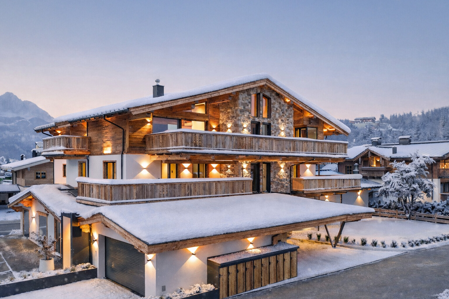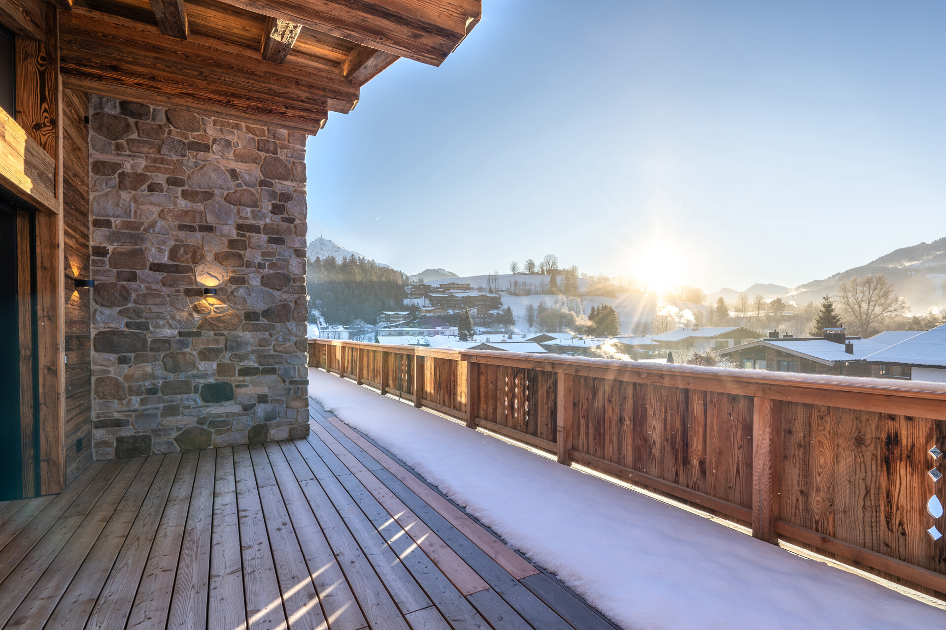 Dieses Penthouse liegt im Herzen von Reith und zeigt eine klare, alpine Architektur mit Naturstein, Altholz und großen Glasflächen. Außen wie innen prägen hochwertige Materialien und eine ruhige, moderne Linie das Gebäude. Der Zugang erfolgt über das Obergeschoss – oder direkt per Lift bis in die Wohnung. Im Obergeschoss führt eine helle, moderne Stiege weiter nach oben. Schon beim Hinaufgehen öffnet sich der Blick zum Wilden Kaiser. Ein Moment, der sofort zeigt, was dieses Penthouse besonders macht. Oben angekommen, steht man direkt im offenen Wohnbereich. Der Wohn- und Essbereich überzeugt mit Sichtdachstuhl, raumhohem Kamin und großformatigen Fensterflächen, die den Kaiserblick auf der Nordostseite und den Hahnenkammblick auf der Südwestseite einfangen. Altholz, Naturstein und klare Formen schaffen ein modernes, warmes Ambiente. Die luxuriöse Poliform-Küche, ausgestattet mit hochwertigen Einbauten der Firma Aufschnaiter, fügt sich präzise in das Gesamtbild ein und verbindet Design mit höchster Handwerkskunst. Vom Wohnbereich führt eine zweite Stiege zur Galerie – ein zusätzlicher Rückzugsbereich mit erhöhter Perspektive auf Raum und Bergkulisse. Drei Schlafzimmer – zwei davon mit Badezimmer en suite – sowie ein weiteres separates Badezimmer bieten hohen Wohnkomfort. Die Sauna mit Glasfront erweitert das Penthouse um einen stilvollen Wellnessbereich, der den Blick in die Landschaft einbezieht. Mehrere Terrassen und Balkone schaffen fließende Übergänge zwischen Innen- und Außenraum. Moderne Haustechnik, praktische Abstellflächen und die zentrale, dabei ruhige Lage unterstreichen den hohen Anspruch dieses Penthouses.