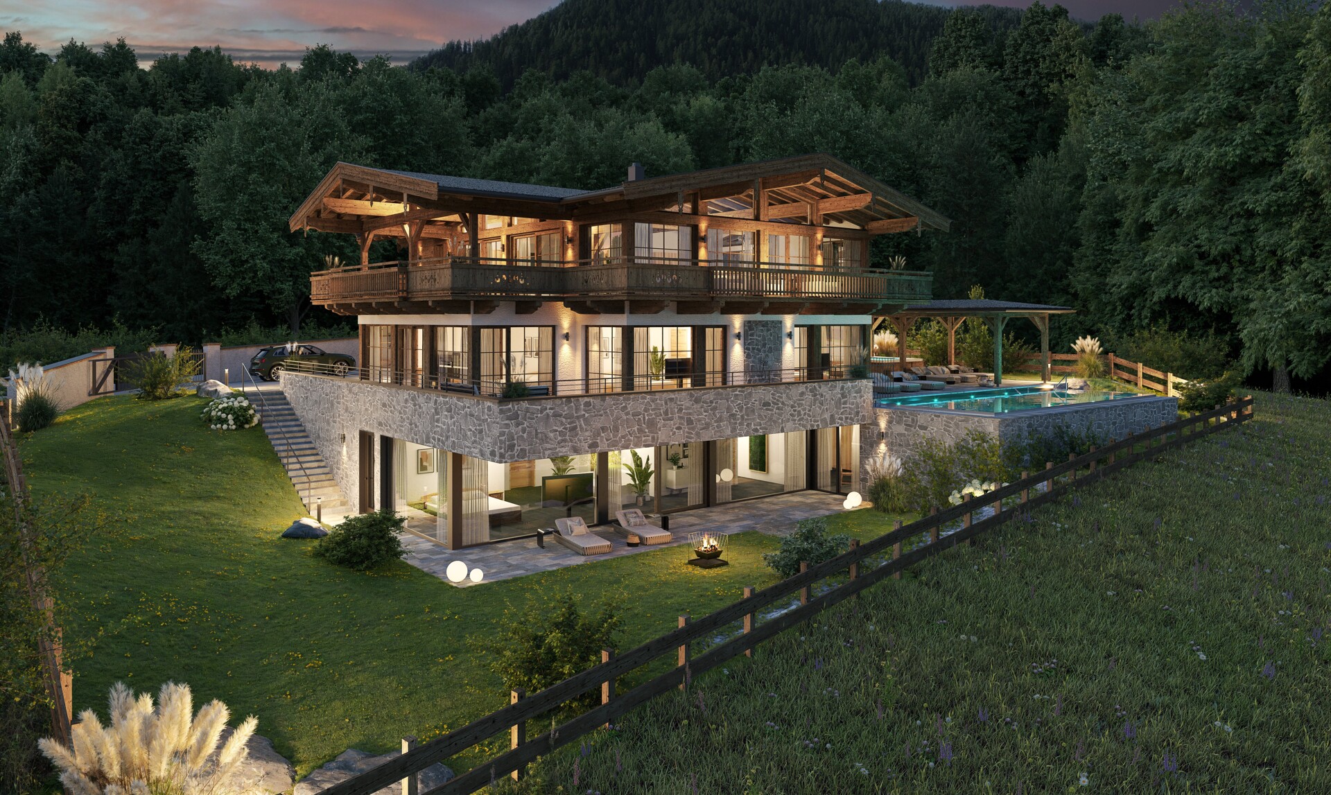 In einer der begehrtesten Lagen von St. Johann in Tirol entsteht dieses herausragende Neubauprojekt, das mit seiner perfekten Symbiose aus moderner Architektur und alpiner Eleganz neue Maßstäbe setzt. Umgeben von unberührter Natur, bietet das Haus nicht nur einen spektakulären Blick auf das Kitzbüheler Horn und den Wilden Kaiser, sondern auch ein Höchstmaß an Privatsphäre und Komfort. O b e r g e s c h o s s: Der großzügige, offene Wohn-, Koch- und Essbereich mit sichtbarem Altholzdachstuhl und luxuriösem Kamin schafft eine außergewöhnliche Wohlfühlatmosphäre. Die High-End-Küche ist ein Highlight für alle, die das Kochen lieben und hohe Ansprüche an Qualität und Design stellen. Der rund um das Haus verlaufende überdachte Freisitz lädt mit einem atemberaubenden Bergblick zum Entspannen ein, während das Büro und die praktischen Zusatzräume höchsten Komfort bieten. E r d g e s c h o s s: Der Masterbereich dieses Hauses ist ein wahres Meisterstück: Ein Schlafzimmer mit freistehender Badewanne, Regendusche und einer eleganten Ankleide bietet den perfekten Raum für Erholung und Luxus. Drei weitere Schlafzimmer mit Bad en Suite sorgen für ausreichend Platz und Komfort für Familie und Gäste. Der Fitnessraum und der beeindruckende Außenbereich mit Infinitypool, Whirlpool und Daybeds vervollständigen dieses außergewöhnliche Angebot. U n t e r g e s c h o s s: Im Untergeschoss finden Sie eine Einliegerwohnung, einen Wellnessbereich mit Sauna sowie einen Weinkeller, der Liebhabern edler Tropfen gerecht wird. Ein großzügiger Technikraum, ein Wirtschaftsraum und eine Tiefgarage mit vier Stellplätzen bieten zusätzlich Komfort und Funktionalität. Das Haus befindet sich in absolut ruhiger und dennoch zentraler Lage am Waldrand, mit ungestörtem Blick auf die imposanten Alpen. Die Umgebung bietet Ihnen sowohl Naturverbundenheit als auch eine hervorragende Anbindung an alle wichtigen Einrichtungen des täglichen Lebens. Individuelle Gestaltungsmöglichkeiten sind möglich, da das Projekt in zwei Varianten angeboten wird – so können Ihre persönlichen Wünsche und Bedürfnisse optimal berücksichtigt werden.