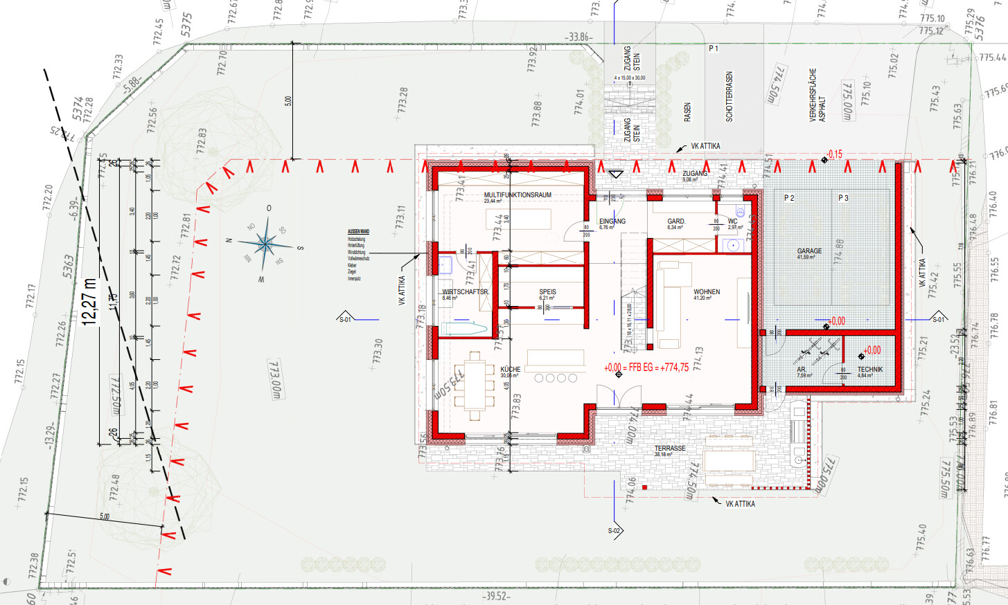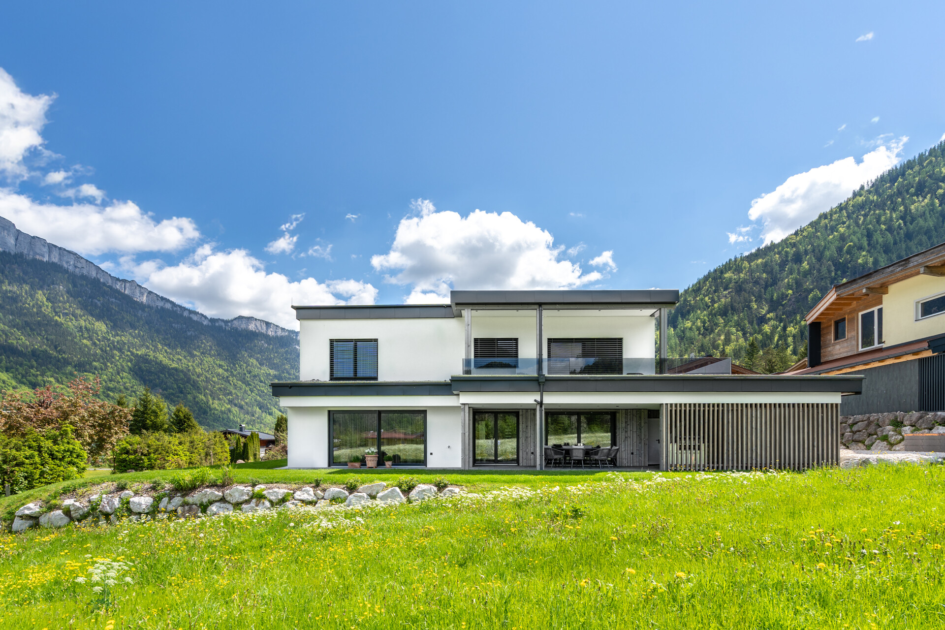 Dieses moderne Einfamilienhaus befindet sich in einer ruhigen und sonnigen Wohngegend in Waidring und bietet einen idealen Rückzugsort mit hoher Privatsphäre sowie herrlichen Ausblicken auf die Tiroler Berge. Die schlichte Fassade beeindruckt ebenso wie die durchdachte Raumaufteilung im Inneren, die viel Platz für Ihre individuellen Gestaltungsmöglichkeiten lässt. Im Erdgeschoss empfängt Sie ein stilvolles Entrée, ein perfekt ausgestattetes Ankleidezimmer, ein Gäste-WC und ein angrenzender Wirtschaftsraum. Das Herzstück der Wohnung ist der offene Wohn- und Essbereich, ausgestattet mit einem Effektkamin und einer hochwertigen Profiküche mit erstklassigen Geräten sowie einer praktischen Back-Kitchen. Bodentiefe Fenster lassen viel Tageslicht in den Raum und schaffen eine helle, einladende Atmosphäre. Von hier aus gelangen Sie direkt auf die überdachte Terrasse, die einen spektakulären Blick auf die umliegende Bergwelt freigibt. Eine Outdoorküche aus Edelstahl ergänzt den Wohnkomfort und sorgt für angenehme Stunden im Freien. Über eine elegante, freischwebende Treppe erreichen Sie das Obergeschoss. Hier befinden sich der Masterbereich mit Ankleide, ein großzügiges Badezimmer mit freistehender Badewanne und Dusche. Vom Masterbereich gelangen Sie auf einen großen teils überdachten Balkon mit weitreichendem Ausblick. Zwei weitere Gästezimmer verfügen jeweils über ein eigenes Bad en Suite. Die Immobilie ist mit zahlreichen maßgefertigten Einbauten, Schränken und Holzverkleidungen ausgestattet. Auch die technischen Details wurden mit höchster Sorgfalt ausgewählt. Elektrische Raffstores, eine Luft-Wärmepumpe, ein Internetanschluss sowie ein KNX Smart Home System gehören selbstverständlich zur Ausstattung. Für Ihre Fahrzeuge stehen ein Doppelcarport mit E-Anschluss sowie zwei Außenstellplätze zur Verfügung. Zusätzlich gibt es einen Technikraum und einen angrenzenden Abstellraum für Sport- und Gartengeräte. Die Immobilie ist nach Absprache kurzfristig verfügbar. Mobiliar ist Verhandlungsbasis.