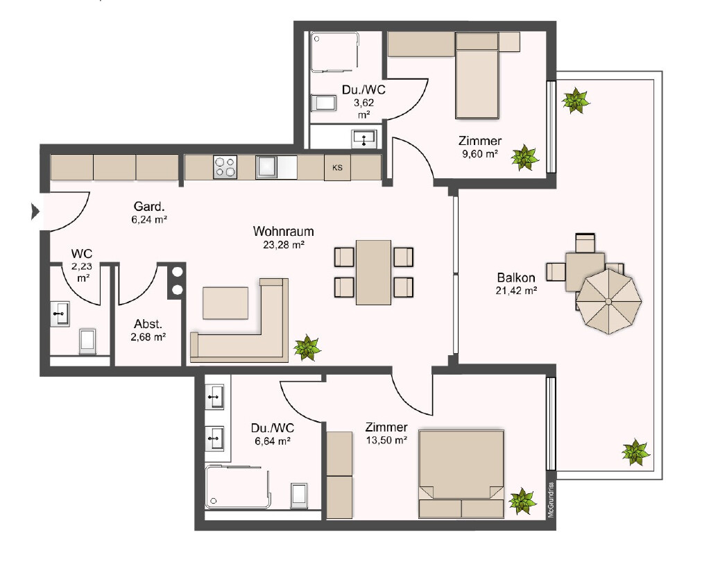 In St. Jakob in Haus, einer der sonnigsten Ortschaften im Bezirk Kitzbühel, entsteht in leichter Hanglage eine exklusive Wohnanlage mit lediglich neun Wohneinheiten. Die hier angebotene Wohnung Top 6 befindet sich im Obergeschoss und überzeugt durch eine durchdachte Raumaufteilung sowie eine hochwertige Ausführung. Die Wohnung verfügt über eine Wohnnutzfläche von ca. 68 m² und bietet zwei Schlafzimmer, jeweils mit eigenem Bad en suite, was ein hohes Maß an Komfort und Privatsphäre gewährleistet. Der offen gestaltete Wohn- und Essbereich ist hell und einladend und bietet direkten Zugang zur Südterrasse mit ca. 21 m², die ideale Voraussetzungen für viele Sonnenstunden schafft. Großzügige Fensterflächen unterstreichen das freundliche Wohnambiente und sorgen für lichtdurchflutete Räume. Die Architektur präsentiert sich modern und zeitlos, umgesetzt von einem erfahrenen, regionalen Bauträger mit zahlreichen erfolgreich realisierten Referenzprojekten. Ein Kellerabteil mit ca. 6 m² ergänzt das Raumangebot sinnvoll. Die Wohnanlage erstreckt sich über drei oberirdische Geschosse und ist über ein zentrales Treppenhaus sowie einen Personenlift komfortabel erschlossen. Im Untergeschoss befindet sich eine Tiefgarage mit insgesamt 17 Stellplätzen, die aufgrund der Hanglage ebenerdig befahrbar ist.